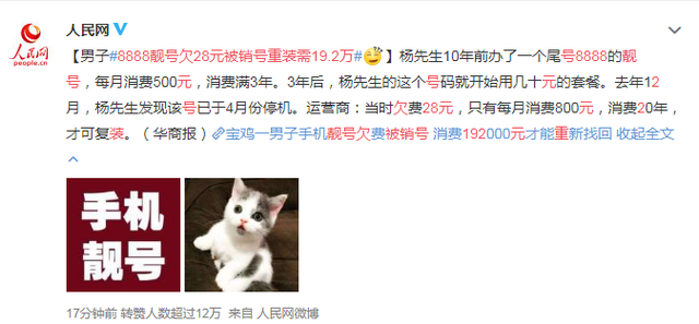 8888手机靓号欠费28元被销号,重装需消费192000元!网友炸锅