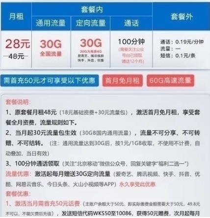 如今三大运营商已进入携号转网的“阵痛”期,另一方面还要布局建设新一代5G网络,要知道5G网络建设是非常“烧钱”的,如果在网络建设完成后,用户却流失了,运营商所要面临的局面是相当惨重的。众所周知,近年来移动用户对移动公司越发的不满,很多用户都想脱离“魔爪”,面对这一局势中国移动终于有所触动,开始打起了价格牌,试图讨好用户。笔者发现又一款原为48元的套餐,如今只需28元。不过,这个套餐真的靠谱吗?