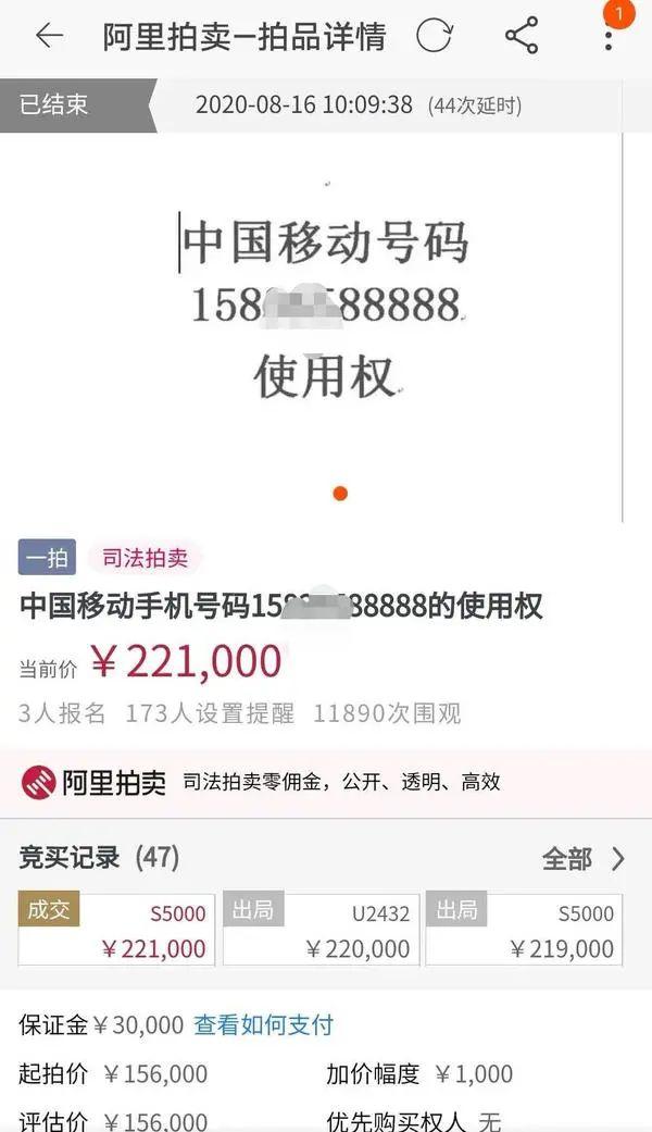 该手机号评估价是15.6万,加价幅度为1000元,三人参与竞拍。最终,经过47轮竞价,44次延时,该手机靓号使用权被竞买人以221000元成功竞得,其间,围观人数达到1万多人次。