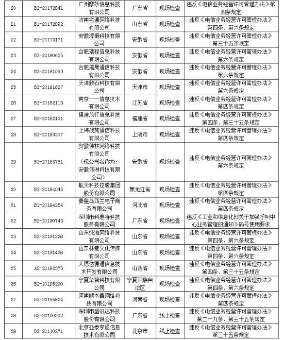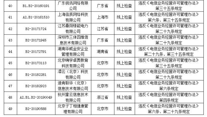 经检查,49家部颁证电信企业因违反《电信业务经营许可管理办法》《工业和信息化部关于加强呼叫中心业务管理的通知》等有关要求,检查结果为不合格。根据相关规定,将其纳入违法不良记录信息库,依法予以处理,并对其在市场准入管理、事中事后监管中加强行政监管。现将检查不合格企业名单予以公告,欢迎社会各界监督。