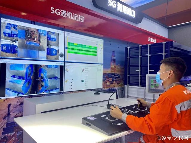 在智慧港口展台,工程师在现场展示5G网络远程控制港机设备。