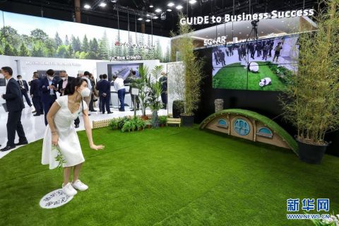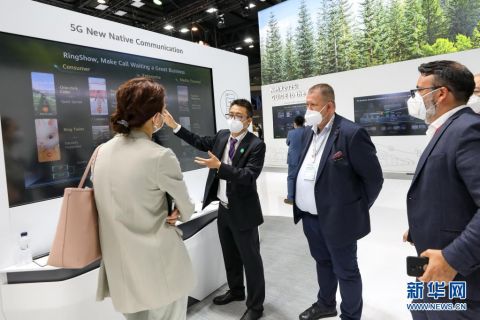 6月28日,在西班牙巴塞罗那,工作人员(左二)在世界移动通信大会华为展厅介绍5G技术的应用场景。 2021世界移动通信大会于6月28日至7月1日在西班牙巴塞罗那举行。5G技术仍是当下热门的话题,5G网络的普及为人们进一步拓宽了想象的边界,其所衍生的应用已开始延伸到生活的各个层面。 新华社记者 张铖 摄